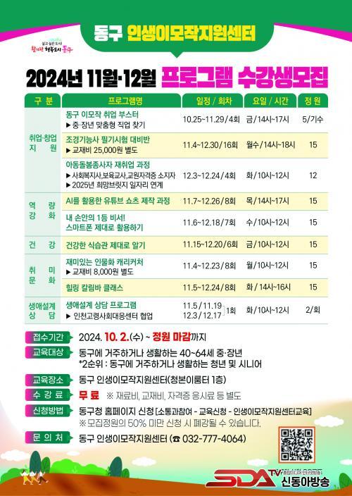 ÇÁ·Î±×·¥Àº 11¿ù~12¿ù ÁøÇàµÇ¸ç, Áß¡¤Àå³âÃþÀÇ Ã롤â¾÷ Áö¿ø, ¿ª·® °È, °Ç° ¹× Ãë¹Ì ¹®È, »ý¾Ö¼³°è µîÀ» À§ÇÑ ÃÑ 9°³ °úÁ¤À¸·Î ¿î¿µÇÑ´Ù.