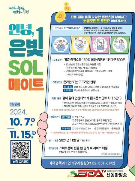 ¡®¾È³ç, ÀººûSOL¸ÞÀÌÆ®¡¯´Â ¾ÈºÎÈ®ÀÎ ¸ð´ÏÅ͸µ ¹× Âü¿©Çü ÄÜÅÙÃ÷ ¿î¿µÀ» ÅëÇØ 1Àΰ¡±¸ÀÇ »çȸÀû °í¸³À» ¿¹¹æÇϱâ À§ÇÑ »ç¾÷ÀÌ´Ù. ÀºÆò±¸ÀÇ 1Àΰ¡±¸ Áö¿øÁ¤Ã¥ ºê·£µåÀÎ ¡®ÀººûSOL¡¯°ú Ä£±¸¸¦ ÀǹÌÇÏ´Â ¡®¸ÞÀÌÆ®(mate)¡¯, ¹Ý°©°Ô Àλç(¾È³ç)ÇÏ´Â ¸ð½ÀÀ» »ç¾÷¸í¿¡ ´ã¾Ò´Ù.