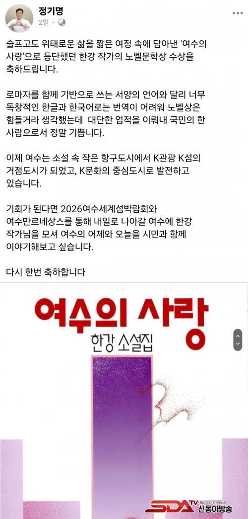 Á¤ ½ÃÀåÀº ¸Þ½ÃÁö¿¡¼ ¡°½½ÇÁ°íµµ À§ÅÂ·Î¿î »îÀ» ªÀº ¿©Á¤ ¼Ó¿¡ ´ã¾Æ³½ ¡®¿©¼öÀÇ »ç¶û¡¯À¸·Î µî´ÜÇß´ø ÇѰ ÀÛ°¡ÀÇ ³ëº§¹®Çлó ¼ö»óÀ» ÃàÇϵ帰´Ù¡±¸ç, ¡°´ë´ÜÇÑ ¾÷Àû¿¡ ±¹¹ÎÀÇ ÇÑ »ç¶÷À¸·Î¼ Á¤¸» ±â»Ú´Ù¡±°í ¹àÇû´Ù.
