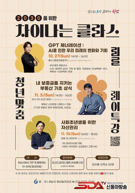 À̹ø Ư°­Àº Çϳ²½Ã °ÅÁÖ ¶Ç´Â ÀçÁ÷ û³â(19~39¼¼)ÀÌ¸é ´©±¸³ª ¹«·á·Î ¼ö°­ÇÒ ¼ö ÀÖÀ¸¸ç, Çϳ²½Ã Áö¿ªº° Á¢±Ù¼ºÀ» °í·ÁÇØ dz»êµ¿, ¸Á¿ùµ¿, °¨Àϵ¿¿¡ À§Ä¡ÇÑ ¹Î°£°ø°£¿¡¼­ ¿î¿µÇÑ´Ù. ¿Â¶óÀÎ »ýÁß°èµµ º´ÇàµÇ¾î »çÀü¿¡ ¿Â¶óÀÎ ¼ö°­À» ½ÅûÇÏ¸é °­ÀÇ URLÀ» ¹Þ¾Æ Àå¼Ò¿¡ ±¸¾Ö¹ÞÁö ¾Ê°í Âü¿©ÇÒ ¼ö ÀÖ´Ù.