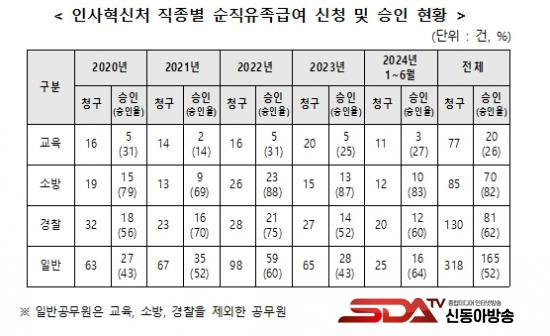 ¡à ±¹È¸ ±³À°À§¿øÈ¸ ¹é½Â¾Æ ÀÇ¿ø(´õºÒ¾î¹ÎÁÖ´ç)ÀÌ ÀλçÇõ½Åó·ÎºÎÅÍ ¹ÞÀº ¡®±³À°¡¤¼Ò¹æ¡¤°æÂû¡¤ÀϹݰø¹«¿ø ¼øÁ÷ ½ÂÀÎ ÇöȲ'¿¡ µû¸£¸é 2020~2024³â 6¿ù ¼øÁ÷ ½Åû 610°Ç Áß ¼øÁ÷ ½ÂÀÎÀ²Àº 55%, 336°ÇÀÎ °ÍÀ¸·Î ³ªÅ¸³µ´Ù.