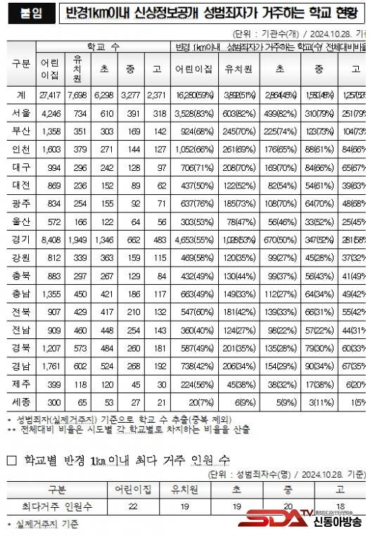 ¡à ±¹È¸ ±³À°À§¿øÈ¸ ¹é½Â¾Æ ÀÇ¿ø(´õºÒ¾î¹ÎÁÖ´ç)ÀÌ ¿©¼º°¡Á·ºÎ·ÎºÎÅÍ Á¦Ãâ¹ÞÀº¡®¹Ý°æ 1kmÀ̳» ½Å»óÁ¤º¸°ø°³ ¼º¹üÁËÀÚ°¡ °ÅÁÖÇÏ´Â Çб³ ÇöȲ¡¯¿¡ µû¸£¸é Àüü Çб³ Áß ¾î¸°ÀÌÁý 59% 16,280°÷, À¯Ä¡¿ø 51% 3,892°÷, ÃʵîÇб³ 45% 2,864°÷, ÁßÇб³ 48% 1,580°÷, °íµîÇб³ 53% 1,257°÷ ÁÖº¯ 1km ³»¿¡ ¼º¹üÁËÀÚ°¡ °ÅÁÖÇÏ´Â °ÍÀ¸·Î Áý°èµÆ´Ù.