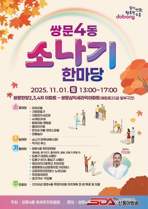 [½Åµ¿¾Æ¹æ¼Û µµºÀ±¸=À̽ŵ¿±âÀÚ] ¼­¿ï µµºÀ±¸ ½Ö¹®4µ¿ÀÌ ¿À´Â 11¿ù 1ÀÏ ÇØµî·Î25±æ ÀÏ¿ø(ÇѾç2,3,4Â÷¾ÆÆÄÆ®~»ïÀͼ¼¶ó¹Í¾ÆÆÄÆ®)¿¡¼­ ¡®2025³â ½Ö¹®4µ¿ ¼Ò¡¤³ª¡¤±â ÇѸ¶´ç¡¯ ÃàÁ¦¸¦ °³ÃÖÇÑ´Ù.