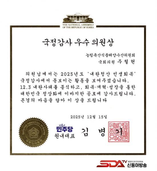 [½Åµ¿¾Æ¹æ¼Û ¿©¼ö=±è±â³² ±âÀÚ] ´õºÒ¾î¹ÎÁÖ´ç ÁÖöÇö ±¹È¸ÀÇ¿ø(Àü³² ¿©¼ö½Ã°©)ÀÌ ¹ÎÁÖ´ç ¿ø³»´ëÇ¥°¡ ¼ö¿©ÇÏ´Â ¡®2025³âµµ ±¹Á¤°¨»ç ¿ì¼öÀÇ¿ø»ó¡¯¿¡ ¼±Á¤µÆ´Ù. 2020³â ÃѼ±¿¡¼­ ´ç¼±µÅ ±¹È¸ ÀÇÁ¤È°µ¿À» ½ÃÀÛÇÑ ÀÌÈÄ Åë»ê 5¹øÂ°ÀÌÀÚ, 2022³âºÎÅÍ 4³â ¿¬¼Ó ¼ö»óÀÌ´Ù.