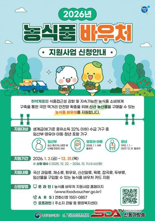 ½Åû ±â°£Àº 2025³â 12¿ù 22ÀϺÎÅÍ 2026³â 12¿ù 11ÀϱîÁö´Ù. ÁÖ¼ÒÁö °üÇÒ µ¿ ÇàÁ¤º¹Áö¼¾ÅÍ ¹æ¹®, ¿Â¶óÀÎ(www.foodvoucher.go.kr) ¶Ç´Â ÀÚµ¿ ÀÀ´ä ½Ã½ºÅÛ(1551-0857)À» ÅëÇØ¼­µµ ½ÅûÇÒ ¼ö ÀÖ´Ù.