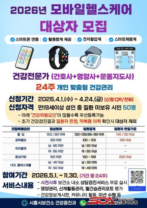 [½Åµ¿¾Æ¹æ¼Û ½ÃÈï½Ã=À̽ŵ¿±âÀÚ] ½ÃÈï½Ãº¸°Ç¼Ò °Ç°­ÁõÁø°ú´Â ½Ã¹Î °Ç°­ ÁõÁø°ú ¸¸¼ºÁúȯ ¿¹¹æÀ» À§ÇØ ¡®2026³â ¸ð¹ÙÀÏ ÇコÄÉ¾î »ç¾÷¡¯À» ¿À´Â 5¿ùºÎÅÍ 11¿ù±îÁö ¿î¿µÇϰí, Âü¿©ÀÚ 50¿© ¸íÀ» 4¿ù 24ÀϱîÁö ¸ðÁýÇÑ´Ù°í ¹àÇû´Ù.
