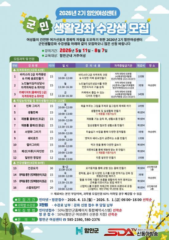 [½Åµ¿¾Æ¹æ¼Û °æ³²ÇÔ¾È=À̽ŵ¿±âÀÚ] ÇԾȱºÀº ±º¹ÎÀÇ ÀÚ±â°è¹ß°ú ¿©¼ºÀÇ °æÁ¦È°µ¿ Áö¿øÀ» À§ÇØ ¡®2026³â 2±â ÇԾȱº¿©¼º¼¾ÅÍ ±º¹Î»ýȰ°­Á¡¯ ¼ö°­»ýÀ» ¸ðÁýÇÑ´Ù°í 6ÀÏ ¹àÇû´Ù.