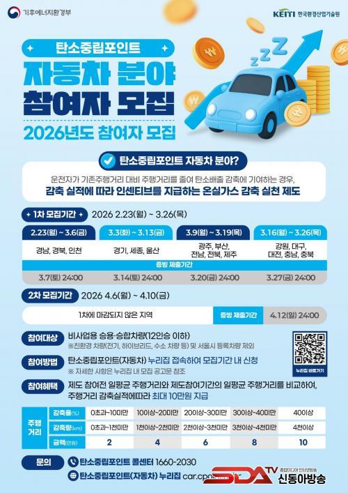 ¡®ÀÚµ¿Â÷ ź¼ÒÁ߸³Æ÷ÀÎÆ®Á¦¡¯´Â Âü¿© Àü ÀÏÆò±Õ ÁÖÇà°Å¸®¿Í Âü¿© ±â°£ÀÇ ÀÏÆò±Õ ÁÖÇà°Å¸®¸¦ ºñ±³ÇØ °¨Ãà ½ÇÀû¿¡ µû¶ó 2¸¸ ¿ø¿¡¼­ ÃÖ´ë 10¸¸ ¿ø±îÁö Àμ¾Æ¼ºê¸¦ Áö±ÞÇÏ´Â Á¦µµ´Ù. ´ë»óÀº 12Àν ÀÌÇÏ ºñ»ç¾÷¿ë ½Â¿ë¤ý½ÂÇÕÂ÷ ¼ÒÀ¯ÀÚ´Ù.