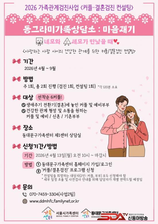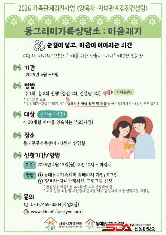 µÎ ÇÁ·Î±×·¥ ¸ðµÎ 2026³â 4¿ùºÎÅÍ 9¿ù±îÁö ¿î¿µµÇ¸ç, ȸ±â´ç ¾à 120ºÐÀÌ ¼Ò¿äµÈ´Ù. Âü¿© ºñ¿ëÀº Àü¾× ¹«·á·Î, ½ÅûÀº 4¿ù 13ÀÏ ¿ÀÀü 10½ÃºÎÅÍ µ¿´ë¹®±¸°¡Á·¼¾ÅÍ È¨ÆäÀÌÁö¸¦ ÅëÇØ °¡´ÉÇÏ´Ù.