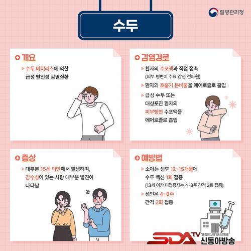 ¼öµÎ´Â ¼öµÎ¤ý´ë»óÆ÷Áø ¹ÙÀÌ·¯½º¿¡ ÀÇÇØ ¹ß»ýÇÏ´Â ±Þ¼º ¹ßÁø¼º °¨¿°º´À¸·Î, ¹ß¿­°ú ÇÔ²² Àü½Å¿¡ °¡·Á¿òÀ» µ¿¹ÝÇÑ ¹°Áý¼º ¹ßÁøÀÌ ³ªÅ¸³ª´Â °ÍÀÌ Æ¯Â¡ÀÌ´Ù. ±âħÀ̳ª Àçä±â¸¦ ÅëÇÑ ºñ¸»°ú ¼öÆ÷¾× Á¢ÃË µîÀ» ÅëÇØ ½±°Ô ÀüÆÄµÇ¸ç, Àü¿°·ÂÀÌ °­ÇØ ¾î¸°ÀÌÁý°ú À¯Ä¡¿ø, Çб³ µî Áý´Ü»ýȰ ½Ã¼³À» Áß½ÉÀ¸·Î È®»êÇÒ °¡´É¼ºÀÌ ³ô´Ù.
