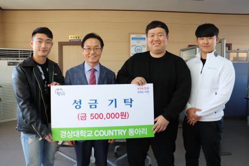 °æ»ó´ëÇб³ µ¿¾Æ¸® COUNTRY(ȸÀå À±Á¤¼ö, ³óÇаú)´Â 30ÀÏ ¿ÀÈÄ 4½Ã ÁøÁֽú¹ÁöÀç´Ü ȸÀǽǿ¡¼­ Áö¿ª ³» ¼Ò³â¼Ò³à°¡Àå µ½±â ¡ºMr. °³Ã´ ¼±¹ß´ëȸ(2019.10.18.)¡»¿¡¼­ ¸ð±ÝµÈ ±âºÎ±Ý 50¸¸¿øÀ» ÁøÁֽú¹ÁöÀç´Ü(ÀÌ»çÀå À̼º°©)¿¡ ±âŹÇß´Ù. COUNTRY´Â 1962³âµµ¿¡ ½Ã¡¦
