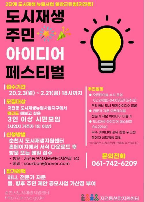 [½Åµ¿¾Æ¹æ¼Û=±è¿ëÈÆ ±âÀÚ] ¼øÃµ½Ã´Â ÀúÀüµ¿, Àåõµ¿¡¤³²Á¦µ¿Áö¿ªÀÇ µµ½ÃÀç»ý »ç¾÷¿¡ ½Ã¹ÎµéÀÇ ÀǰßÀ» ¸ð¾Æ ÃßÁøÇϱâ À§ÇÑ ¡®µµ½ÃÀç»ý ÁֹΠ¾ÆÀ̵ð¾î Æä½ºÆ¼¹ú¡¯ÀÇ Âü°¡ÀÚ¸¦ 2¿ù 21ÀÏ(±Ý)±îÁö ¸ðÁýÇÑ´Ù°í ¹àÇû´Ù. ¡®µµ½ÃÀç»ý ÁֹΠ¾ÆÀ̵ð¾î Æä½ºÆ¼¹ú¡¯Àº ÁֹεéÀÌ Á÷Á¢¡¦