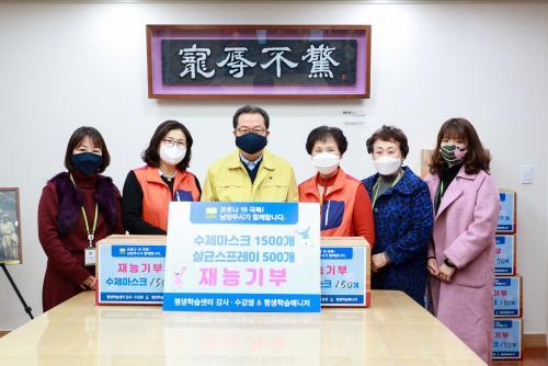 [½Åµ¿¾Æ¹æ¼Û=¹Ú´ë¿µ ±âÀÚ] ³²¾çÁֽà Æò»ýÇнÀ¿ø(¿øÀå Á¶¼º±â)Àº 6ÀÏ ½ÃÀå Áý¹«½Ç¿¡¼­ Æò»ýÇнÀ¼¾ÅÍ ¼ö°­»ý°ú ÇнÀµî´ë¸Å´ÏÀú Àç´É±âºÎ·Î Á¦ÀÛÇÑ ¼öÁ¦¸¶½ºÅ©¿Í ÈÞ´ë¿ë »ì±Õ½ºÇÁ·¹À̸¦ ½Ã¹Î¿¡°Ô Àü´ÞÇß´Ù. Äڷγª-19 ½É°¢´Ü°è °Ý»óÀ¸·Î ÀÎÇÑ ¸¶½ºÅ© ǰ±ÍÇö»óÀ» ½Ã¹Îµé¡¦