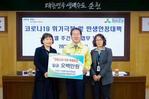 [½Åµ¿¾Æ¹æ¼Û=±è¿ëÈÆ ±âÀÚ] ¼øÃµ½Ã »çȸº¹Áö°ø¹«¿ø ¸ðÀÓÀÎ ¡®»çȸº¹ÁöÇàÁ¤¿¬±¸È¸¡¯´Â Áö³­ 9ÀÏ ½Ãû ¼ÒȸÀǽǿ¡¼­ Äڷγª19 Ưº°¼º±Ý 5¹é¸¸ ¿øÀ» Àü´ÞÇß´Ù. ¼º±ÝÀÇ Àü´ÞÀº °£ºÎȸÀÇ ¼®»ó¿¡¼­ Çã¼® ¼øÃµ½ÃÀå¿¡°Ô Àü´ÞÇß´Ù. »çȸº¹Áö°øµ¿¸ð±Ýȸ¸¦ ÅëÇØ ÁöÁ¤ ±âŹµÇ´Â¡¦