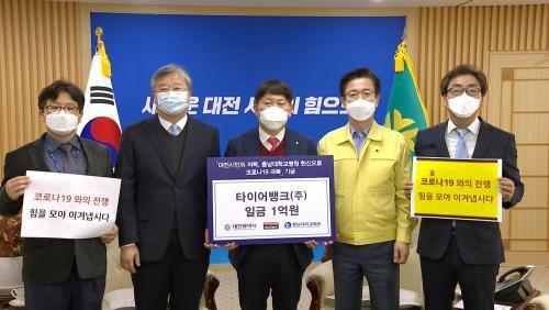 [½Åµ¿¾Æ¹æ¼Û=Áö¿ì¿­ ±âÀÚ] ´ëÀü½Ãû ÀÀÁ¢½Ç¿¡¼­ ÇãÅÂÁ¤ ´ëÀü½ÃÀå°ú ±èÁ¤±Ô ŸÀ̾î¹ðÅ©¢ß ȸÀå, À±È¯Áß Ãæ³²´ëÇб³º´¿øÀåÀÌ Âü¼®ÇÑ °¡¿îµ¥ ¡®Äڷγª19 ±Øº¹ ±âºÎ±Ý¡¯±âʽÄÀ» °¡Á³´Ù. ŸÀ̾î¹ðÅ©¢ß ±èÁ¤±Ô ȸÀåÀº Äڷγª19 °¨¿°º´ÀÇ Áö¿ªÈ®»ê ¹æÁö¸¦ À§ÇØ ½á´Þ¶ó¸ç 1¡¦