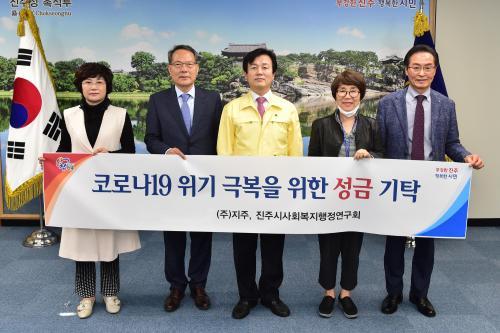 [½Åµ¿¾Æ¹æ¼Û=È«¼øÅ±âÀÚ]ÁøÁÖ½Ã(½ÃÀå Á¶±ÔÀÏ)´Â Àç´Ü¹ýÀÎ ÁøÁֽú¹ÁöÀç´Ü(ÀÌ»çÀå À̼º°©)Àº 23ÀÏ ¿ÀÈÄ 4½Ã ÁøÁÖ½Ãû ±â¾÷ÀÎÀÇ ¹æ¿¡¼­ Äڷγª19 ´ëÀÀÀ» À§ÇÑ Áö¿ª»çȸ ±â°ü¡¤´ÜüµéÀÇ ¼º±Ý ±âʽÄÀ» °¡Á³´Ù. À̳¯ ±âŹ½Ä¿¡´Â ÁÖ½Äȸ»ç ÁöÁÖ(´ëÇ¥ Á¤¼ö¾ð)¿¡¼­ ¼º±Ý 50¡¦