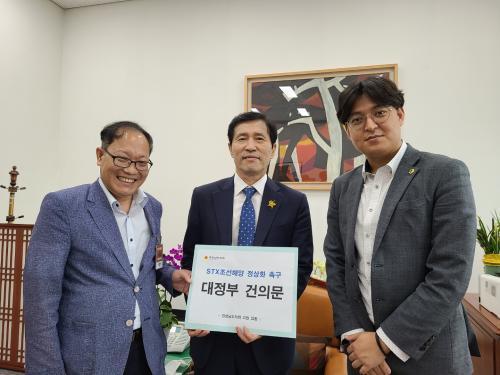 [½Åµ¿¾Æ¹æ¼Û=È«¼øÅ ±âÀÚ] °æ»ó³²µµÀÇȸ °æÁ¦È¯°æÀ§¿øÈ¸ ¼Ò¼Ó ¼Û¿À¼º ´õºÒ¾î¹ÎÁÖ´ç ¿ø³»´ëÇ¥¿Í ½Å»óÈÆ ÀÇ¿øÀº 7¿ù 27ÀÏ ±¹È¸¸¦ ¹æ¹®ÇÏ¿© ¡®STXÁ¶¼±Çؾç Á¤»óÈ­ Ã˱¸ ´ëÁ¤ºÎ °ÇÀǾȡ¯À» Àü´ÞÇß´Ù. À̳¯ ¼Û¿À¼º ¿ø³»´ëÇ¥¿Í ½Å»óÈÆ ÀÇ¿øÀº ÀÌÇпµ »ê¾÷Åë»óÀÚ¿øÁß¼Òº¥Ã³±â¡¦