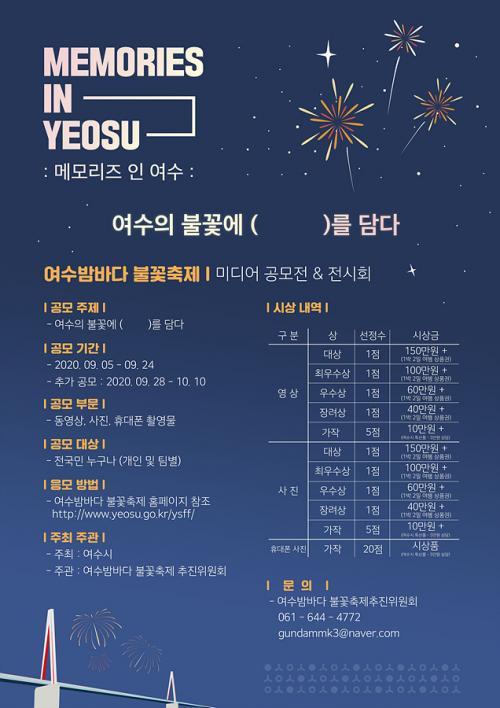 [½Åµ¿¾Æ¹æ¼Û=±è±â³² ±âÀÚ] ¿©¼ö½Ã(½ÃÀå ±Ç¿ÀºÀ)¿Í ¿©¼ö¹ã¹Ù´ÙºÒ²ÉÃàÁ¦À§¿øÈ¸(À§¿øÀå À̹®ºÀ)´Â ¡®Memories in Yeosu¡¯¸¦ ÁÖÁ¦·Î ¡®2020 ¿©¼ö¹ã¹Ù´Ù ºÒ²ÉÃàÁ¦ ¹Ìµð¾î °ø¸ðÀü¡¯À» °³ÃÖÇÑ´Ù°í 7ÀÏ ¹àÇû´Ù. À̹ø ¹Ìµð¾î °ø¸ðÀüÀº UCC¿Í »çÁø 2°³ ºÎºÐÀ¸·Î ³ª´©¾î ÁøÇàÇÏ¡¦