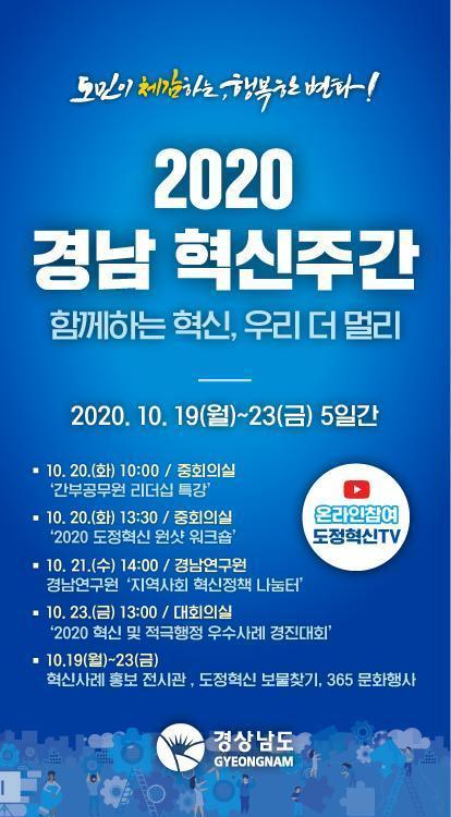 [½Åµ¿¾Æ¹æ¼Û=ÇÏÀç±Ç ±âÀÚ] °æ»ó³²µµ(µµÁö»ç ±è°æ¼ö)°¡ ¡®ÇÔ²²ÇÏ´Â Çõ½Å ¿ì¸® ´õ ¸Ö¸®¡¯¶ó´Â ½½·Î°ÇÀ¸·Î 10¿ù 19ÀϺÎÅÍ 23ÀϱîÁö ÃÑ 5Àϰ£ µµÃ» ÀÏ¿ø ¼­ ¡®2020 °æ³² Çõ½ÅÁÖ°£¡¯À» °³ÃÖÇÑ´Ù. ¹Î¼± 7±â ±è°æ¼ö µµÁ¤Àº ±×°£ °æÁ¦Çõ½Å¡¤»çȸÇõ½Å¡¤µµÁ¤Çõ½Å3´ë Çõ½ÅÀ» Á߽ɡ¦