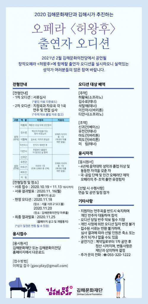 [½Åµ¿¾Æ¹æ¼Û´º½º=Ç㳪¿µ ±âÀÚ] °æ³² ±èÇØ¹®È­Àç´Ü°ú ±èÇØ½Ã°¡ ÃßÁøÇϴ âÀÛ¿ÀÆä¶ó Çã¿ÕÈÄ Ã⿬ÀÚ¸¦ ¼±¹ßÇϱâ À§ÇÑ Àü±¹ ¿Àµð¼ÇÀ» °³ÃÖÇÕ´Ï´Ù. 4³âÁ¦ À½¾Ç´ëÇÐ ¼º¾Ç°ú Á¹¾÷ÀÚÀ̰ųª, ±¹¡¤°ø¸³ ´Üü ¹× ¹Î°£ ¿ÀÆä¶ó´Ü Á¦ÀÛÀÇ ¿ÀÆä¶ó ÁÖ¡¤Á¶¿ª Ã⿬ °æÇèÀÚ¶ó¸é ´©±¸³ª¡¦