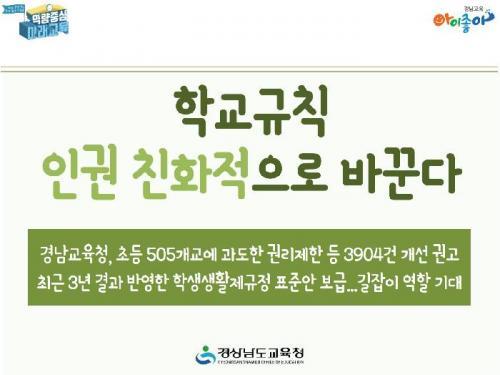 [½Åµ¿¾Æ¹æ¼Û=±è´ë¿ø ±âÀÚ] °æ»ó³²µµ±³À°Ã»(±³À°°¨ ¹ÚÁ¾ÈÆ)Àº ÃʵîÇб³ÀÇ Çб³±ÔÄ¢ Áß Çлý»ýȰ °ü·Ã ±ÔÁ¤À» Àü¼öÁ¶»çÇÏ¿© °úµµÇÑ ±Ç¸® Á¦ÇѰú ÀαÇÄ§ÇØ ¼ÒÁö°¡ ÀÖ´Â Á¶Ç×À» ÀÎ±Ç Ä£È­ÀûÀ¸·Î °³¼±ÇÒ °ÍÀ» ±Ç°íÇÏ¿´´Ù. ¶Ç Áö±Ý±îÁö ÃàÀûµÈ Á¡°Ë °á°ú¿¡ ´ëÇØ ±³À°°øµ¿Ã¼ÀÇ ¡¦