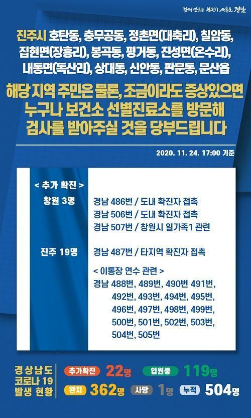 [½Åµ¿¾Æ¹æ¼Û=ÇÏÀç±Ç ±âÀÚ] °æ»ó³²µµ¿¡¼­ Áö³­ 24ÀÏ ¿ÀÈÄ 5½Ã ÀÌÈÄ·Î Äڷγª19 ½Å±Ô È®ÁøÀÚ°¡ 22¸í ¹ß»ýÇß´Ù. 25ÀÏ ¿ÀÀü °æ»ó³²µµ ºê¸®Çο¡ µû¸£¸é, ½Å±Ô È®ÁøÀÚ´Â ÁøÁÖ 19¸í(°æ³² 487¹ø~505¹ø), â¿ø 3¸í(°æ³² 486¹ø, 506~507¹ø)À̸ç, È®ÁøÀÏÀº 24ÀÏ 1¸í(°æ³² 486¹ø¡¦