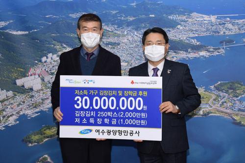 [½Åµ¿¾Æ¹æ¼Û=±è±â³² ±âÀÚ] ¿©¼ö±¤¾çÇ׸¸°ø»ç(»çÀå Â÷¹Î½Ä)´Â Áö³­ 9ÀÏ ¿¬¸»¿¬½Ã ÀÌ¿ô»ç¶û ½Çõ°ú Àú¼Òµæ °¡Á¤À» ÈÄ¿øÀ» À§ÇØ 2,000¸¸ ¿ø »ó´çÀÇ ±èÀå±èÄ¡ 250¹Ú½º¿Í ÀåÇÐ±Ý 1,000¸¸ ¿øÀ» ¿©¼ö½Ã¿¡ Àü´ÞÇß´Ù. ¿©¼ö½Ã´Â Àü³²»çȸº¹Áö°øµ¿¸ð±Ýȸ¿¡ ÁöÁ¤±âŹÀ» °ÅÃÄ ±èÀ塦