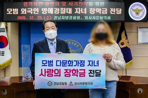 [½Åµ¿¾Æ¹æ¼Û=°­¿µÈÆ ±âÀÚ] °æ³²°æÂûû(ûÀå ³²±¸ÁØ)°ú ¿Ü»çÀÚ¹®ÇùÀÇȸ(ȸÀå ¹ÚÀç±æ)´Â Äڷγª19·Î ÀÎÇØ ¾î·Á¿òÀ» °Þ°í ÀÖ´Â ¸ð¹ü ¿Ü±¹ÀÎ ¸í¿¹°æÂû´ë ´ë¿ø(6¸í) ÀÚ³àµé¿¡°Ô ÀåÇÐ±Ý Àü´Þ Çà»ç¸¦ ÇÏ¿´´Ù. À̹ø Çà»ç´Â, Äڷγª-19·Î ÀÎÇØ ¾î·Á¿î »çȸ ¿©°Ç¿¡µµ ºÒ±¸ÇÏ°í ¡¦