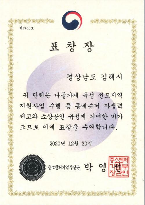 [½Åµ¿¾Æ¹æ¼Û=¼ÛÇöÁÖ ±âÀÚ] ±èÇØ½Ã´Â 2020³â Áß¼Ò½´ÆÛ Áö¿ø»ç¾÷ Æò°¡¿¡¼­ ¿ì¼ö±â°ü¿¡ ¼±Á¤µÅ Áß¼Òº¥Ã³±â¾÷ºÎÀå°ü ǥâÀ» ¼ö»óÇß´Ù°í ¹àÇû´Ù. ½Ã´Â ³ªµé°¡°ÔÀÇ À¯Åëȯ°æ°ú Á¶Á÷È­ ±â¹Ý ¸¶·ÃÀ¸·Î ³ªµé°¡°Ô °æÀï·ÂÀ» °­È­ÇÏ°í ¼Ò»ó°øÀÎ À°¼º¿¡ ±â¿©ÇÑ °ø·Î¸¦ ÀÎÁ¤¹Þ¾Ò´Ù.¡¦