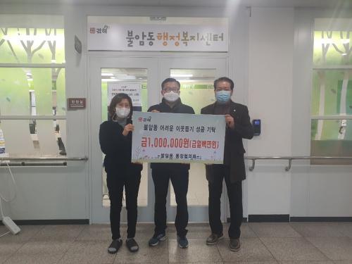[½Åµ¿¾Æ¹æ¼Û=¼ÛÇöÁÖ ±âÀÚ] ºÒ¾Ïµ¿ ÅëÀåÇùÀÇȸ(ȸÀå Ç㿵µ·)´Â 18ÀÏ ºÒ¾Ïµ¿ ÇàÁ¤º¹Áö¼¾Å͸¦ ¹æ¹®ÇÏ¿© °ü³» Àú¼ÒµæÃþ¿¡°Ô ÀüÇØ´Þ¶ó¸ç Çö±Ý 100¸¸¿øÀ» ±âŹÇß´Ù. Ç㿵µ· ÅëÀåÇùÀÇȸÀåÀº ¡°ÅëÀå 15¸íÀÌ ¾î·Á¿î ÀÌ¿ôÀ» »ý°¢Çϸç ÀÚ¹ßÀûÀ¸·Î ¸ðÀº ¼º±ÝÀÌ´Ù. Äڷγª 19·Î ¾î¡¦