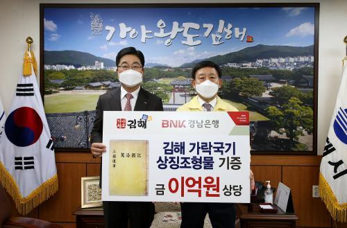 [½Åµ¿¾Æ¹æ¼Û=Ȳ¿ëȯ ±âÀÚ] BNK °æ³²ÀºÇà(ÀºÇàÀå ȲÀ±Ã¶)Àº 27ÀÏ ±èÇØ½ÃûÀ» ¹æ¹®ÇØ Ç㼺°ï ½ÃÀå¿¡°Ô °¡¶ô±¹±â »ó¡Á¶Çü¹° ±âÁõ¼­¸¦ Àü´ÞÇß´Ù. À̹ø ±âÁõÀº °¡¾ß»ç¸¦ ÁÖÁ¦·Î ¼­¼úÇÑ ÇöÁ¸ÇÏ´Â À¯ÀÏÇÑ ¿ª»ç¼­ÀÎ °¡¶ô±¹±âÀÇ ³»¿ëÀ» ´ãÀº Á¶Çü¹°À» ¼³Ä¡ÇØ ¡®°¡¾ß¿Õµµ ±èÇØ¡¦
