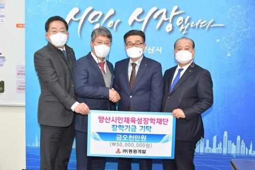 [½Åµ¿¾Æ¹æ¼Û=Ç㳪¿µ ±âÀÚ] ¢ßµ¿¿ø°³¹ßÀº 27ÀÏ ¾ç»ê½Ã¸¦ ¹æ¹®ÇØ ±èÀ챂 ¾ç»ê½ÃÀå°ú ÀÓÀçÃá ÀåÇÐÀç´Ü ÀÌ»çÀå µîÀÌ Âü¼®ÇÑ °¡¿îµ¥ ÀåÇбâ±Ý ±âʽÄÀ» °¡Á³´Ù. ¾ç»ê¿¡¼­ µ¿¿ø·Î¾âCC¸¦ ¿î¿µ ÁßÀÎ ¢ßµ¿¿ø°³¹ß(ȸÀå À庹¸¸)Àº ±³À°»ç¾÷¿¡µµ ³²´Ù¸¥ ¿­Á¤°ú öÇÐÀÌ ÀÖ¾î 1994³â¡¦