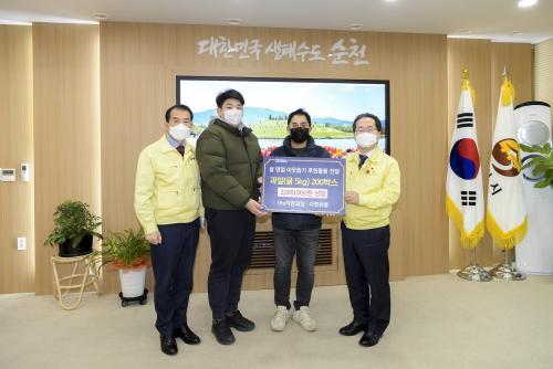 [½Åµ¿¾Æ¹æ¼Û=±è¿ëÈÆ ±âÀÚ] ¼øÃµ½Ã(½ÃÀå Çã¼®)´Â Áö³­ 2ÀÏ theÂøÇѰúÀÏ, ´Ù¿øÀ¯Åë¿¡¼­ ¼³ ¸íÀý¸ÂÀÌ °úÀÏ 200»óÀÚ(300¸¸¿ø »ó´ç)¸¦ ±âŹ¹Þ¾Ò´Ù. À̳¯ ±âŹµÈ °úÀÏÀº ±Ö 5kg 200»óÀÚ·Î °ü³» »çȸº¹Áö½Ã¼³ ¹× Ãë¾à°èÃþ¿¡°Ô °ñ°í·ç Àü´ÞµÆ´Ù. theÂøÇѰúÀÏ È²¹Î¼ö ´ëÇ¥¡¦