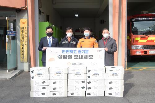 [½Åµ¿¾Æ¹æ¼Û=Ȳ¿ëȯ ±âÀÚ] ±èÇØ½ÃÀÇȸ ÀÇȸ¿î¿µÀ§¿øÈ¸´Â Áö³­ 5ÀÏ, ¼³ ¸íÀýÀ» ¸Â¾Æ ³»¿Ü119¾ÈÀü¼¾Å͸¦ ¹æ¹®ÇØ Á÷¿øµéÀ» °Ý·ÁÇϰí À§¹®Ç°À» Àü´ÞÇß´Ù. À̹ø ¹æ¹®Àº ½Ã¹ÎÀÇ »ý¸í°ú ¾ÈÀüÀ» À§ÇØ 24½Ã°£ Çå½ÅÀûÀ¸·Î ÀÏÇÏ´Â ¼Ò¹æ´ë¿øµé¿¡°Ô °¨»çÀÇ ¶æÀ» ÀüÇϰíÀÚ ¸¶·ÃµÆÀ¸¡¦