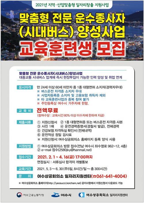[½Åµ¿¾Æ¹æ¼Û=±è±â³² ±âÀÚ] ¿©¼ö½Ã(½ÃÀå ±Ç¿ÀºÀ)´Â 2021³â °í¿ë³ëµ¿ºÎ ÀÏÀÚ¸® °ø¸ð»ç¾÷À¸·Î ÃßÁøÇÏ´Â ¡®¸ÂÃãÇü Àü¹® ¿î¼öÁ¾»çÀÚ ¾ç¼º»ç¾÷¡¯ ±³À° ÈÆ·Ã»ý 25¸íÀ» 4¿ù 16ÀϱîÁö ¸ðÁýÇÑ´Ù°í ¹àÇû´Ù. ½Ã¿¡ µû¸£¸é ÁÖ 52½Ã°£ ±Ù·Î½Ã°£ ´ÜÃàÀ¸·Î ÀÎÇÑ Áö¿ª ´ëÁß±³Åë ¿î¼Û¾÷°è¡¦