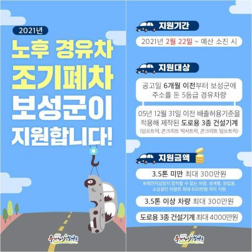 [½Åµ¿¾Æ¹æ¼Û=¹Ú±¤¿Á±âÀÚ] º¸¼º±ºÀº ¿À´Â 22ÀϺÎÅÍ ³ëÈÄ °æÀ¯Â÷ Á¶±âÆóÂ÷ Áö¿ø »ç¾÷ µî 2021³â ¹Ì¼¼¸ÕÁö Àú°¨ Áö¿ø »ç¾÷À» ½ÃÀÛÇÑ´Ù°í ¹àÇû´Ù. À̹ø¿¡ ÃßÁøµÇ´Â »ç¾÷Àº ¡â³ëÈÄ °æÀ¯Â÷ Á¶±âÆóÂ÷ Áö¿ø »ç¾÷(300´ë), ¡âLPG È­¹°Â÷ ½ÅÂ÷ ±¸ÀÔ Áö¿ø(10´ë), ¡âÀü±âÀÚµ¿Â÷ º¸¡¦