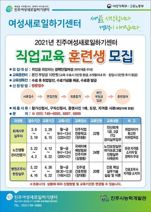 [½Åµ¿¾Æ¹æ¼Û=°­¿µÈÆ ±âÀÚ] ÁøÁֽà ´É·Â°³¹ß°ü ºÎ¼³ ÁøÁÖ¿©¼º»õ·ÎÀÏÇϱ⼾ÅÍ(ÀÌÇÏ ÁøÁÖ»õÀϼ¾ÅÍ, ¼¾ÅÍÀå ÀÌÁ¡Áø)¿¡¼­´Â 3¿ù 8ÀϺÎÅÍ È¸°è»ç¹«½Ç¹«ÀÚ °úÁ¤À» ½ÃÀÛÀ¸·Î 2021³â Á÷¾÷±³À°ÈÆ·Ã ±³À°»ýÀ» ¸ðÁýÇÑ´Ù°í 23ÀÏ ¹àÇû´Ù. ¿ÃÇØ ½Ç½ÃÇÏ´Â Á÷¾÷±³À°ÈÆ·ÃÀº °æ·Â´ÜÀý¿©¼º¡¦