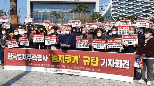 [½Åµ¿¾Æ¹æ¼Û´º½º=±ÇÁöÇý ±âÀÚ] Àü±¹ ³ó¹Îȸ ÃÑ¿¬¸Í ºÎ»ê °æ³²¿¬¸Í ¼Ò¼Ó ³ó¹ÎµéÀÌ 8ÀÏ Çѱ¹ÅäÁöÁÖÅðø»ç(LH) Á÷¿øµéÀÇ ¶¥ Åõ±â ÀÇȤ°ú °ü·ÃÇØ ÁøÁÖ LH º»»ç Á¤¹® ¾Õ¿¡¼­ '³óÁöÅõ±â' ±Ôź ±âÀÚȸ°ßÀ» ¿­¾ú½À´Ï´Ù. ³ó¹ÎµéÀº "3±â ½Åµµ½Ã LH Á÷¿øµéÀÌ Åõ±âÇÑ ¶¥ Áß 98.6¡¦