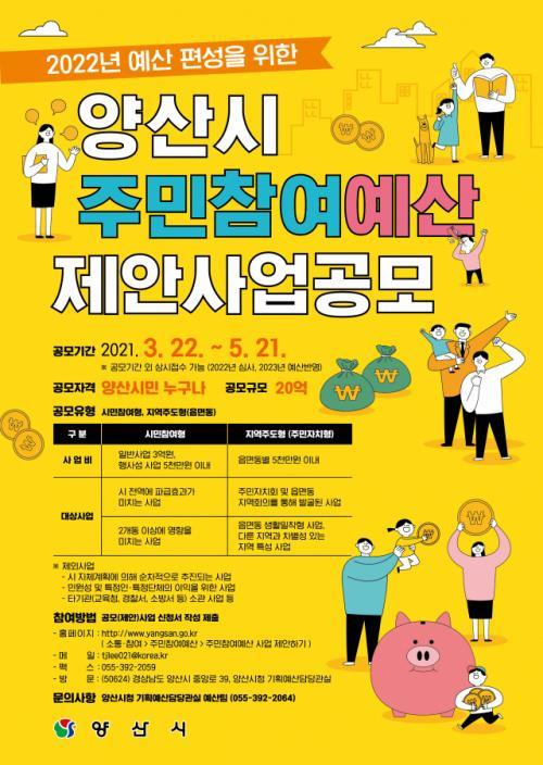 [½Åµ¿¾Æ¹æ¼Û=Ç㳪¿µ ±âÀÚ] ¾ç»ê½Ã(½ÃÀå ±èÀϱÇ)´Â ¿À´Â 22ÀϺÎÅÍ 5¿ù 21ÀϱîÁö 2022³âµµ ¿¹»êÆí¼ºÀ» À§ÇÑ ÁÖ¹ÎÂü¿©¿¹»ê Á¦¾È»ç¾÷ °ø¸ð Á¢¼ö¸¦ ÁøÇàÇÑ´Ù°í ¹àÇû´Ù. °ø¸ð ½ÅûÀº ¾ç»ê½Ã¹ÎÀÌ¸é ´©±¸³ª °¡´ÉÇϸç, Á¦¾È ´ë»ó»ç¾÷Àº ¡ã½Ã¹Î¿¡°Ô °í¸£°Ô ¼öÇý°¡ µ¹¾Æ°¡´Â »ç¾÷¡¦