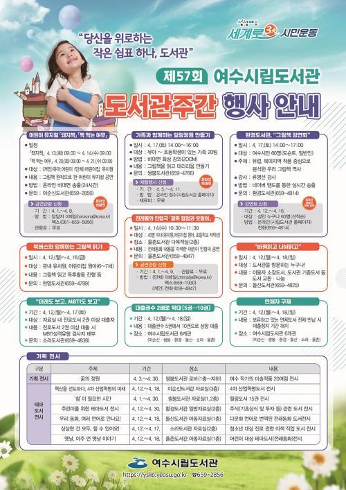 [½Åµ¿¾Æ¹æ¼Û=±è±â³² ±âÀÚ] ¿©¼ö½Ã(½ÃÀå ±Ç¿ÀºÀ)´Â ¿À´Â 12ÀϺÎÅÍ 21ÀϱîÁö ¿©¼ö½Ã¸³µµ¼­°ü 7°³°ü(À̼ø½Å¡¤½ÖºÀ¡¤Çö¾Ï¡¤È¯°æ¡¤µ¹»ê¡¤¼Ò¶ó¡¤À²ÃÌ)¿¡¼­ Á¦57ȸ µµ¼­°üÁÖ°£ Çà»ç¸¦ °³ÃÖÇÑ´Ù. À̹ø µµ¼­°ü ÁÖ°£Àº ¡®´ç½ÅÀ» À§·ÎÇÏ´Â ÀÛÀº ½°Ç¥ Çϳª, µµ¼­°ü¡¯ ¶ó´Â ÁÖÁ¦·Î¡¦
