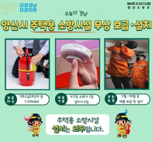 [½Åµ¿¾Æ¹æ¼Û=Ç㳪¿µ ±âÀÚ] ¾ç»ê¼Ò¹æ¼­(¼­Àå ¹ÚÁ¤¹Ì)´Â ¿À´Â 5¿ùºÎÅÍ 10¿ù±îÁö È­Àç¿¡ Ãë¾àÇÑ 7,370¼¼´ë¸¦ ´ë»óÀ¸·Î ÁÖÅÃ¿ë ¼Ò¹æ½Ã¼³À» ¹«»óÀ¸·Î º¸±Þ¡¤ ¼³Ä¡ÇÑ´Ù°í 15ÀÏ ¹àÇû´Ù. À̹ø ÁÖÅÃ¿ë ¼Ò¹æ½Ã¼³ ¹«»ó º¸±Þ¡¤¼³Ä¡´Â È­Àç¿¡ Ãë¾àÇÑ °¡Á¤¿¡ ¼ÒÈ­±â¡¤°¨Áö±â º¸±ÞÀ»¡¦