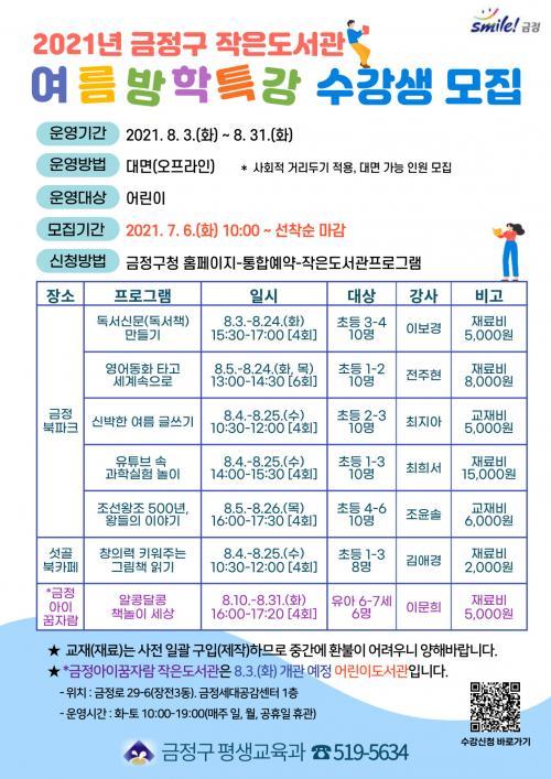 [½Åµ¿¾Æ¹æ¼Û=º¯ÀçÈ£ ±âÀÚ] ºÎ»ê ±ÝÁ¤±¸(±¸Ã»Àå Á¤¹Ì¿µ)´Â ¡®2021³â ±ÝÁ¤±¸ ÀÛÀºµµ¼­°ü ¿©¸§¹æÇРƯ°­¡¯ ¼ö°­»ýÀ» ¿À´Â 6ÀÏ ¿ÀÀü 10½Ã ±¸Ã» ´©¸®Áý(www.geumjeong.go.kr)¿¡¼­ ¼±Âø¼ø ¸ðÁýÇÑ´Ù. ³»´Þ 3ÀϺÎÅÍ 31ÀϱîÁö ¿î¿µµÇ´Â ¿ÃÇØ ¿©¸§¹æÇРƯ°­Àº ¾î¸°À̵éÀÌ ¹æÇб⡦
