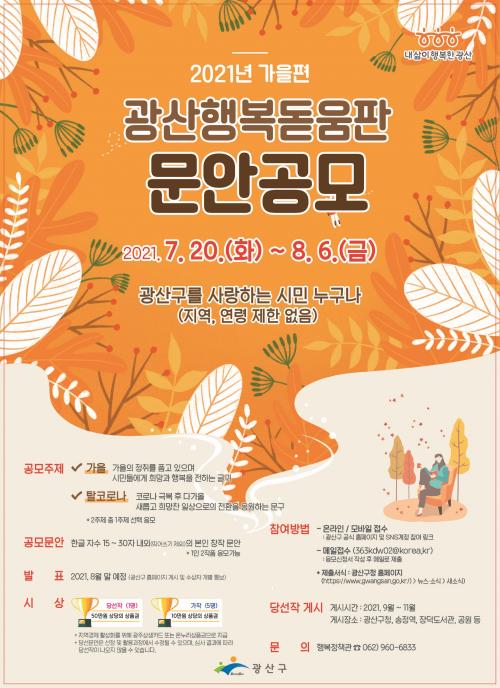 [½Åµ¿¾Æ¹æ¼Û=À̺´±¸ ±âÀÚ] ±¤ÁÖ ±¤»ê±¸(±¸Ã»Àå ±è»ïÈ£)°¡ °¡À»Æí ¡®±¤»êÇູµ¸¿òÆÇ¡¯ ¹®¾ÈÀ» °ø¸ðÇÑ´Ù. 20ÀϺÎÅÍ 8¿ù6ÀϱîÁö °¡À»À» ÁÖÁ¦·Î ÇÏ´Â °¨¼º¹®±¸¿Í Å»(÷­)Äڷγª ÀÀ¿ø¹®±¸ µÎ °¡Áö¸¦ °ø¸ðÇÑ´Ù. °¡À»ÀÇ Á¤Ã븦 ´ã¾Æ ½Ã¹Îµé¿¡°Ô Èñ¸Á°ú ÇູÀ» ÀüÇÏ´Â ±Û±Í¡¦