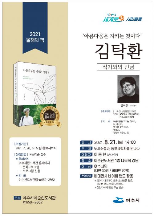 [½Åµ¿¾Æ¹æ¼Û=±è±â³² ±âÀÚ] ¿©¼ö½Ã¸³µµ¼­°üÀÌ ¿À´Â 21ÀÏ ¡®Àü¶ó³²µµ 2021 ¿ÃÇØÀÇ Ã¥¡¯ ¹®ÇÐ ºÎ¹®¿¡ ¼±Á¤µÈ ¡®¾Æ¸§´Ù¿òÀº ÁöŰ´Â °ÍÀÌ´Ù¡¯ÀÇ ÀúÀÚ ±èŹȯ ÀÛ°¡¿ÍÀÇ ¸¸³²À» ¸¶·ÃÇØ ´«±æÀ» ²ö´Ù. À̹ø ¡®ÀÛ°¡¿ÍÀÇ ¸¸³²¡¯Àº ¿ÃÇØÀÇ Ã¥À» ÇÔ²² ÀÐÀ¸¸ç Åä·ÐÇÏ°í ¼ÒÅëÇÔ¡¦