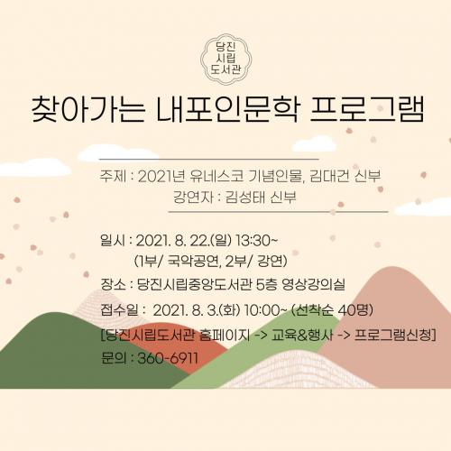 [½Åµ¿¾Æ¹æ¼Û=ÀÌÀçö±âÀÚ] ´çÁø½Ã¸³Áß¾Óµµ¼­°ü¿¡¼­ ¿À´Â 22ÀÏ ¡¸2021³â À¯³×½ºÄÚ ±â³äÀι°, ±è´ë°Ç ½ÅºÎ¡¹¸¦ ÁÖÁ¦·Î ¿ÀÈÄ 1½Ã 30ºÐ¿¡ ¡®Ã£¾Æ°¡´Â ³»Æ÷ Àι®ÇРÇÁ·Î±×·¥¡¯ÀÌ °³Ãֵȡ¦