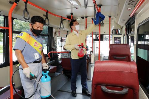 (sdatv=±èÀçÂù±âÀÚ) ±è»ïÈ£ ±¤»ê±¸Ã»ÀåÀÌ 11ÀÏ ¿ÀÀü ±¤»ê±¸ ¸¶À»¹ö½º Äڷγª19 ¹æ¿ª »óȲÀ» Á¡°ËÇϰí, ¾÷ü¿Í ¿î¼öÁ¾»çÀÚ¸¦ °Ý·ÁÇß´Ù. ±è»ïÈ£ ûÀåÀº À̳¯ Çϳ²2Áö±¸¿¡ Àִ ȸÂ÷Áö¸¦ ã¾Æ Â÷·® ³»ºÎ ¹æ¿ªÀ» ½Ç½ÃÇÑ µÚ °£´ãȸ¸¦ °®°í Äڷγª19·Î ÀÎÇØ °æ¿µÀÌ ¾ÇÈ­µÇ°í¡¦