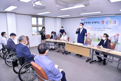 (½Åµ¿¾Æ¹æ¼Û=±èÀçÂù±âÀÚ)À̿뼷 ±¤ÁÖ±¤¿ª½ÃÀåÀº 17ÀÏ ¼­±¸Àå¾ÖÀκ¹Áö°üÀ» ã¾Æ 20¿© °³ÀÇ Àå¾Ö °ü·Ã ±â°ü¡¤´Üü¡¤½Ã¼³ °ü°èÀÚµéÀÌ Âü¼®ÇÑ °¡¿îµ¥ ¡®»ý»ýÅäÅ©¡¯¸¦ ¿­°í ÇöÀå°ú ¼ÒÅëÇÏ´Â ½Ã°£À» °¡Á³´Ù. »ý»ýÅäÅ©´Â 17ÀϺÎÅÍ 20ÀϱîÁö ¿î¿µµÇ´Â ¡®Äڷγª19 ±Øº¹À» À§ÇÑ¡¦