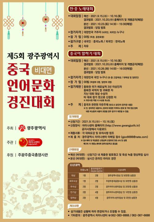 [½Åµ¿¾Æ¹æ¼Û=±èÀçÂù±âÀÚ] ±¤ÁÖ±¤¿ª½Ã(½ÃÀå À̿뼷)°¡ ÁÖÃÖÇÏ°í ±¤ÁÖ±¤¿ª½Ã Â÷À̳ª¼¾ÅÍ(¼¾ÅÍÀå Á¶°æ¿Ï È£³²´ë ¼ö)°¡ ÁÖ°üÇÏ´Â ¡®Á¦5ȸ ±¤ÁÖ±¤¿ª½Ã Áß±¹¾ð¾î¹®È­ °æÁø´ëȸ¡¯°¡ ¿À´Â 10¿ù¿¡ ¿­¸°´Ù. ±¤ÁÖ-Áß±¹ÀÇ ¿ìÈ£±³·ù ÁõÁø°ú ±Û·Î¹ú ÀÎÀç À°¼ºÀ» À§ÇØ ¸¶·ÃµÇ´Â '±¤¡¦