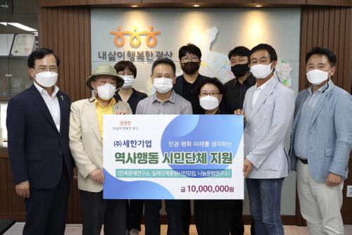 [½Åµ¿¾Æ¹æ¼Û=À̺´±¸±âÀÚ] ¢ß¼¼Çѱâ¾÷ÀÌ 15ÀÏ ±¤»ê±¸Ã»¿¡¼­ Àü´Þ½ÄÀ» °®°í ¿ª»ç Á¤ÀÇ¿Í ÀαÇ‧ÆòÈ­ °¡Ä¡ ½ÇÇöÀ» À§ÇØ ³ë·ÂÇϰí ÀÖ´Â ¹ÎÁ·¹®Á¦¿¬±¸¼Ò ±¤ÁÖÀü³²ÁöºÎ, ÀÏÁ¦°­Á¦µ¿¿ø ½Ã¹Î¸ðÀÓ, ³ª´®¹®È­¿¬±¸¼Ò µî ½Ã¹Î´Üü 3°÷¿¡ ÃÑ 1000¸¸ ¿øÀ» ÈÄ¿øÇß´Ù.