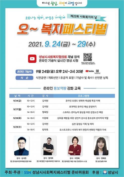 [½Åµ¿¾Æ¹æ¼Û=¹Ú´ë¿µ ±âÀÚ] ¡®Á¦22ȸ »çȸº¹ÁöÀÇ ³¯(9.7)¡¯À» ±â³äÇÑ ¼º³²½Ã »çȸº¹Áö Æä½ºÆ¼¹úÀÌ ¿À´Â 9¿ù 24ÀϺÎÅÍ 29ÀϱîÁö ¿Â¶óÀÎÀ¸·Î °³ÃֵȴÙ. ¡®Äڷγª´Â ¸Ö¸®, ¸¶À½Àº °¡±õ°Ô, ¿À~º¹Áö Æä½ºÆ¼¹ú¡¯À» ½½·Î°ÇÀ¸·Î ÇÏ´Â À̹ø Çà»ç´Â ¼º³²½Ã»çȸº¹ÁöÆä½ºÆ¼¹ú Áغñ¡¦